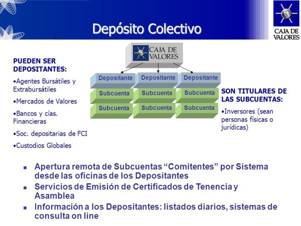 Depósito colectivo de valores (articulo 79 Decreto 36-96)Es un contrato mediante el cual el depositante entrega a una bolsa de comercio o a la sociedad que esta designe, una serie de valores para su custodia, debiendo devolvérsele los mismos valores u otros equivalentes, por el mismo monto, clase y especie de los depositados.